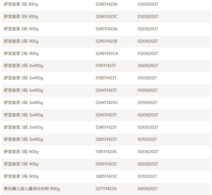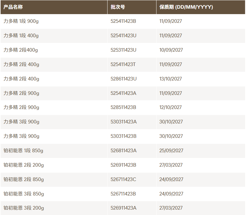 根据雀巢中国的公告,此次召回行动涉及4个品牌的婴幼儿配方奶粉产品,分别为力多精、铂初能恩、舒宜能恩以及惠氏膳儿加儿童成长奶粉,共计30个批次。雀巢中国在公告中明确指出,所有在中国大陆市场注册并销售的其他产品,包括雀巢特殊医学用途婴儿配方食品、超启能恩、启赋、S26铂臻等均不受本次召回影响。