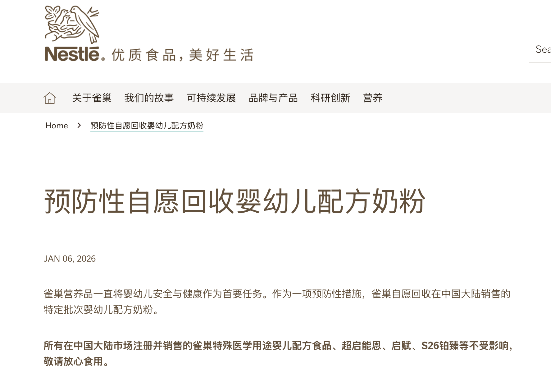 近日,全球知名食品企业雀巢公司宣布在全球多个国家启动预防性召回程序,涉及特定批次的婴幼儿配方奶粉产品。1月6日,雀巢中国在其官网发布《预防性自愿回收婴幼儿配方奶粉》公告,表示在中国大陆市场对相关产品实施自愿召回。这一事件迅速引发社会各界,特别是婴幼儿家庭和乳制品行业的高度关注。
